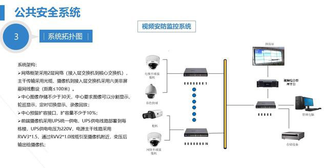 Ø网络框架采用2层网络(接入层交换机到核心交换机),主干传输采用光缆,摄像机到接入层交换机采用六类非屏蔽网线敷设(距离≤100米)。